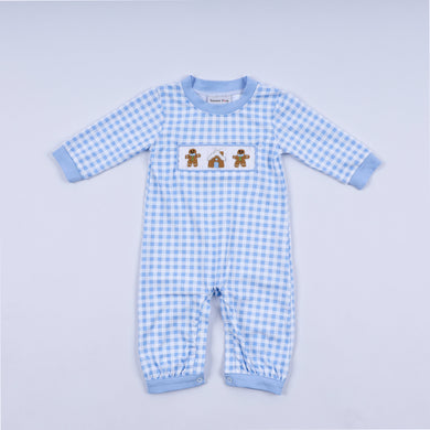 Blue gingerbread hand smocked gingham romper