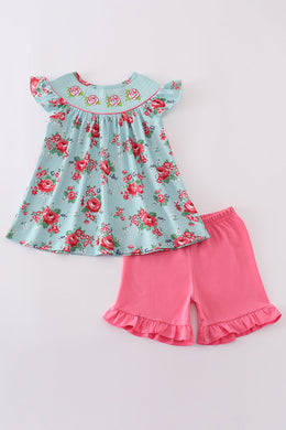 Pink floral print smocked set