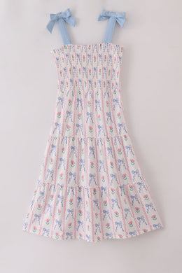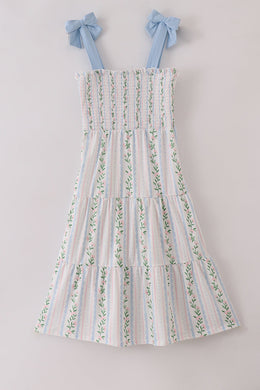 Blue floral bow print smocked mom dress