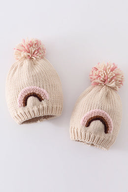 Rainbow hand embroidered pom pom beanie hat