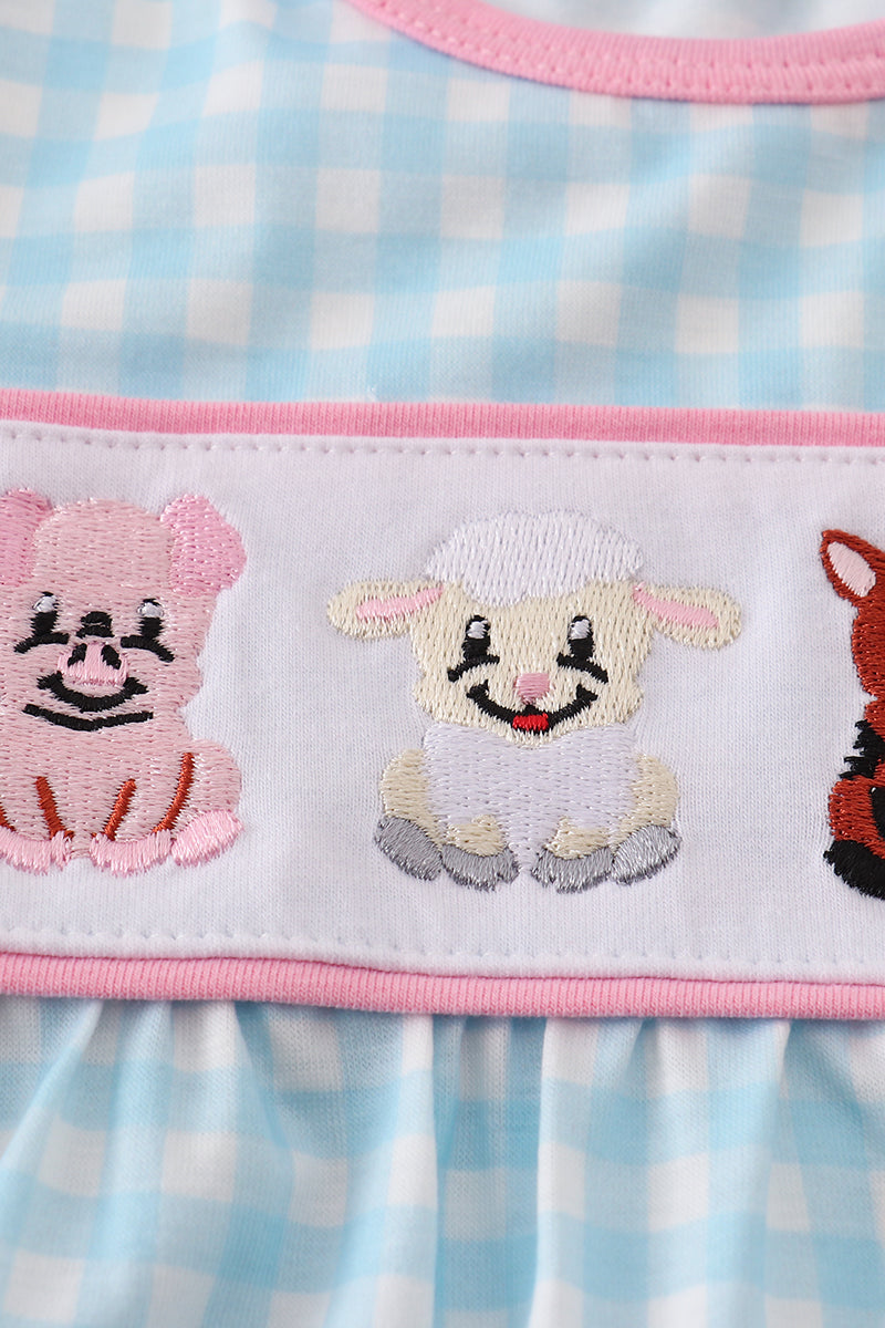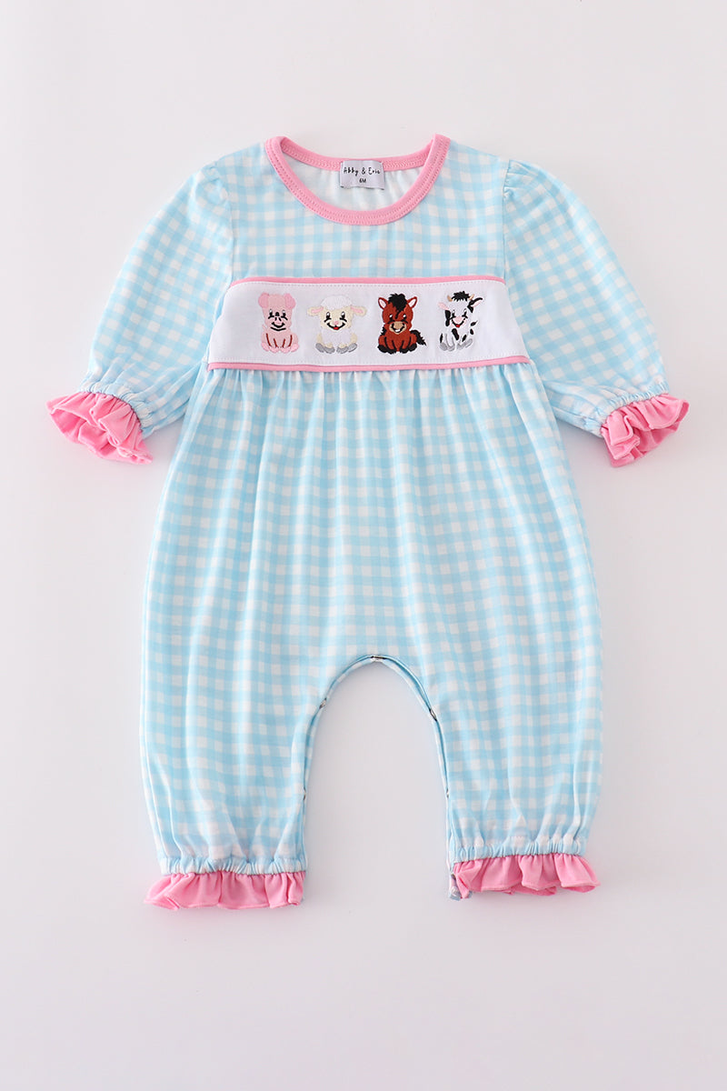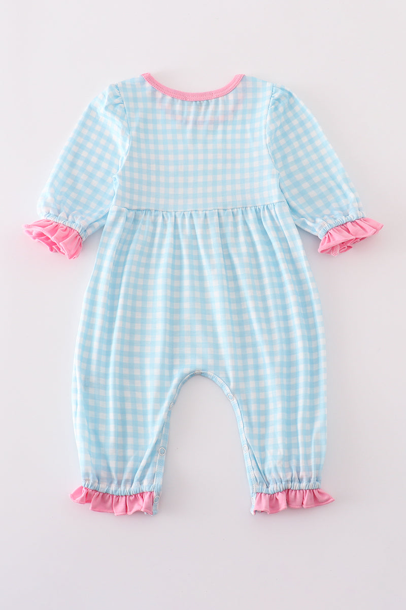 This charming romper features a playful blue gingham pattern with delicate farm-inspired embroidery and flirty ruffle details. Perfect for sunny days and outdoor adventures, it combines comfort and style for your little one’s carefree moments.