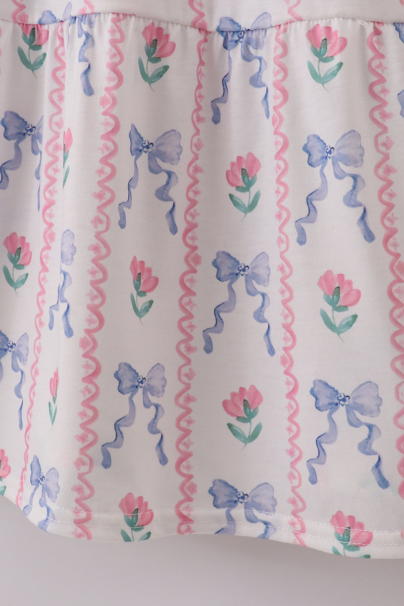 Capture the attention of everyone with this playful and stylish blue floral bow print smocked mom dress. With its unique design and comfortable smocked fit, you'll feel like the most fashionable mom around. Perfect for any occasion, this dress is a must-have for any quirky and fun-loving individual!