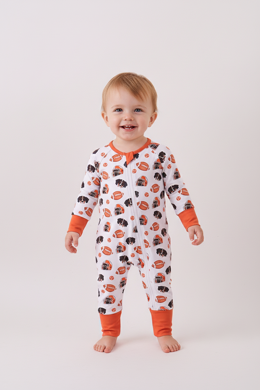 Celebrate sunny days with this premium orange Tennessee print romper made from soft, breathable bamboo fabric. Designed for comfort and style, it's perfect for playful adventures or relaxing afternoons. The vibrant orange hue and unique Tennessee print add a cheerful pop to any outfit, making it a fun wardrobe favorite. Easy to wear and gentle on the skin, this romper brings a touch of southern charm to your everyday fun.