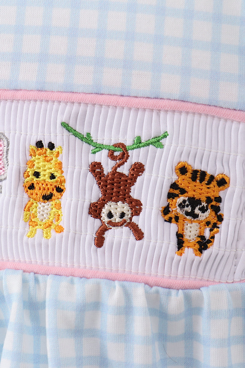• Load image into Gallery viewer, Blue animal smocked ruffle bloomer set