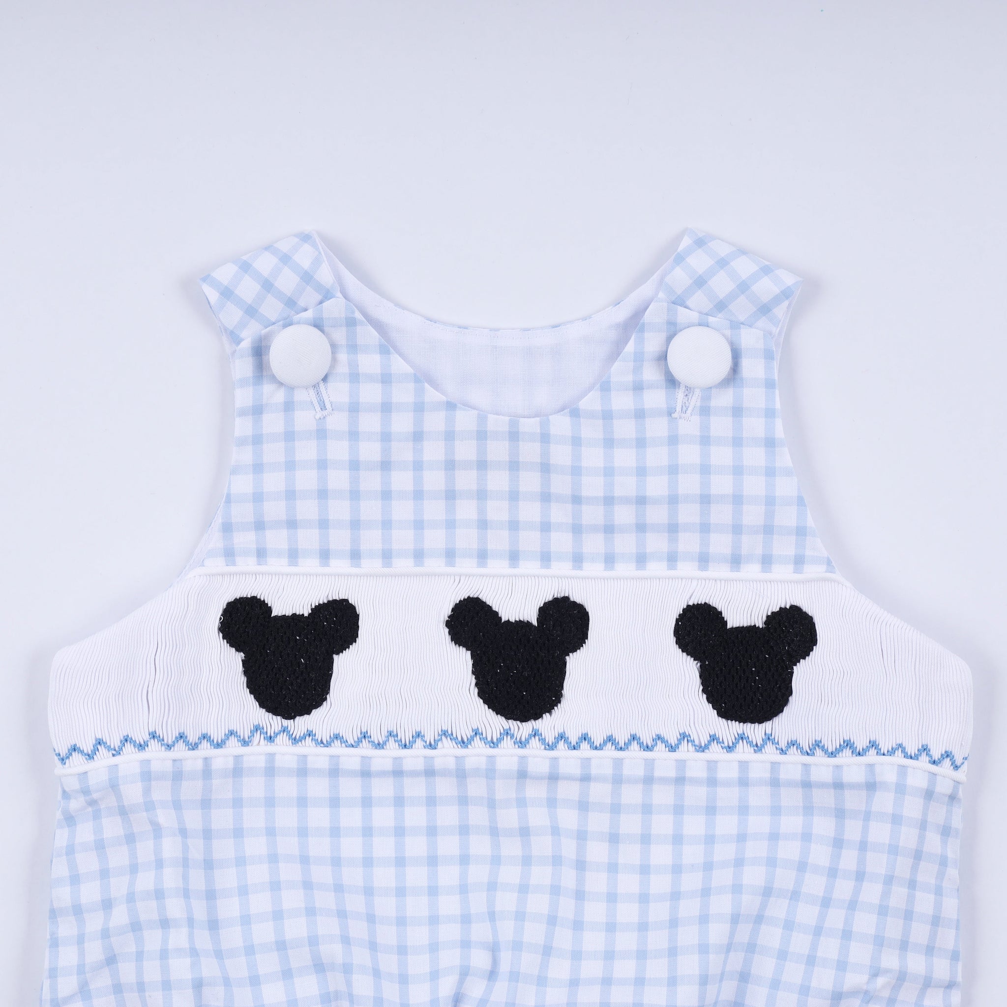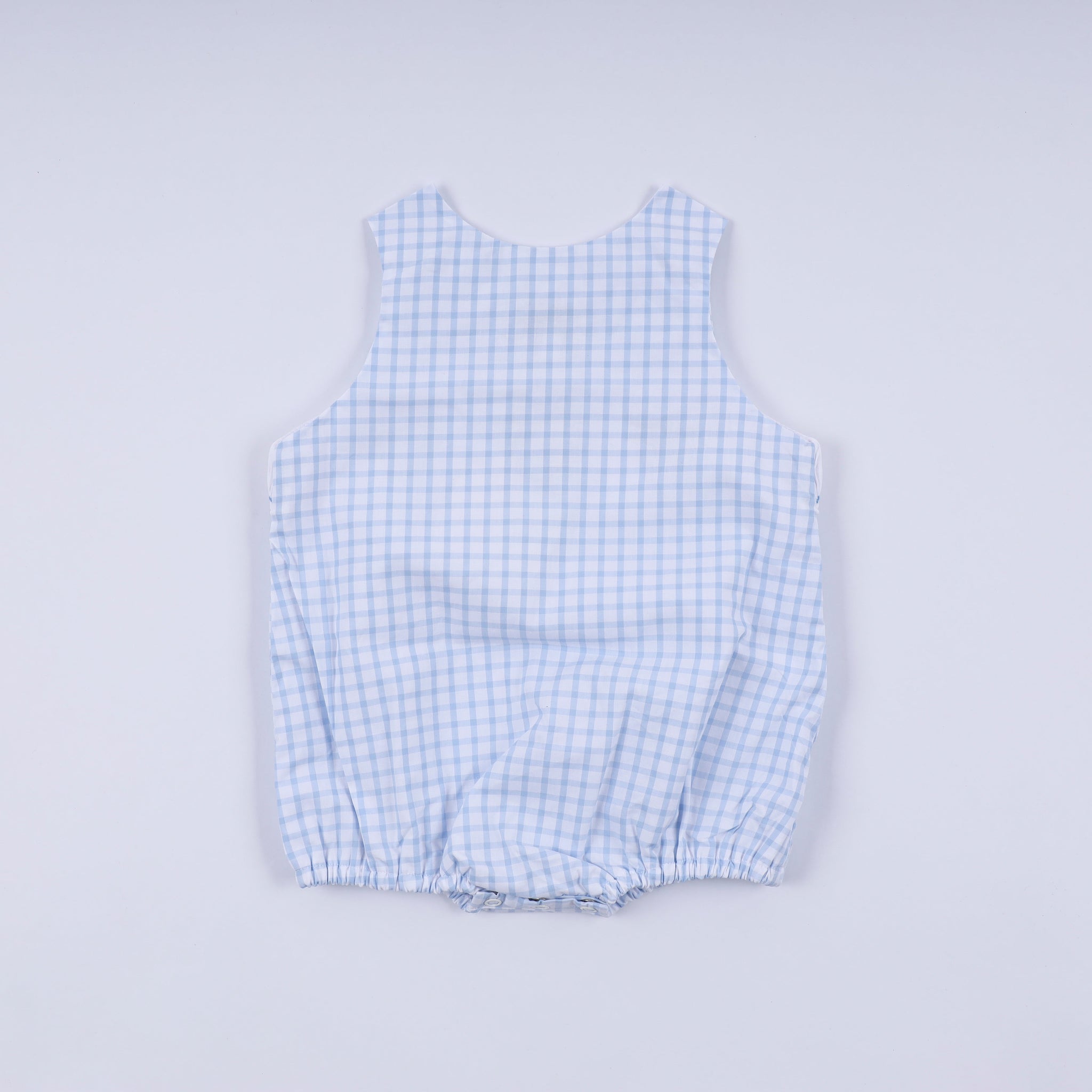 Adorable bubble romper featuring a charming character design set against classic gingham checks. Hand-smocked detailing adds texture and vintage-inspired appeal, while the relaxed bubble silhouette keeps little ones comfortable and stylish. Perfect for playdates, family outings, or everyday wear. The soft blue palette complements any wardrobe, making this a versatile piece that parents and kids will love.