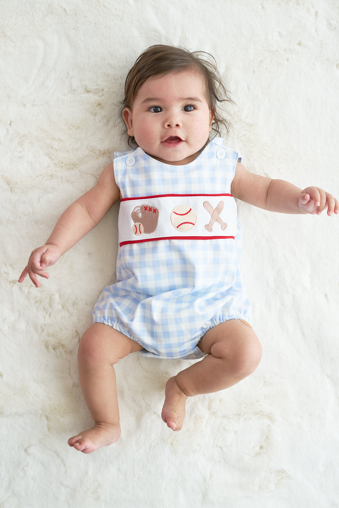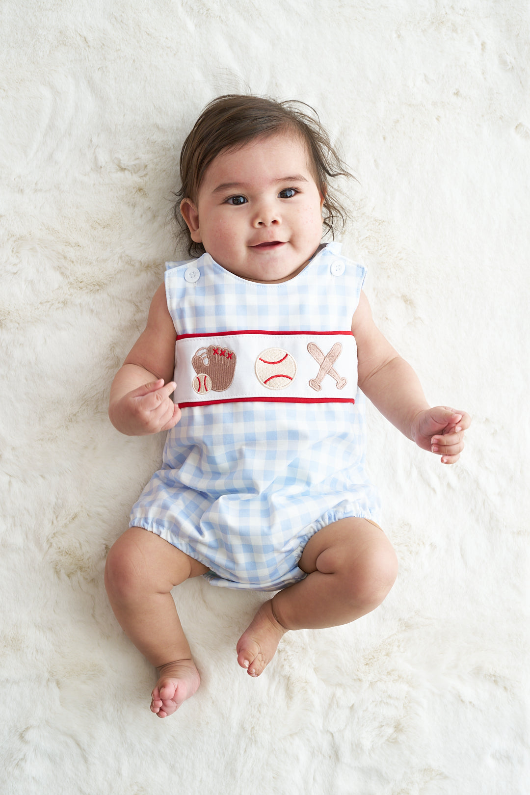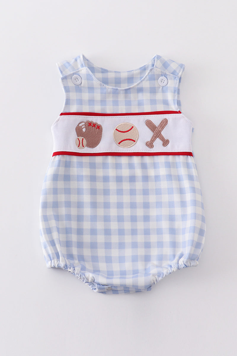 Get ready for a home run with this blue plaid baseball embroidered bubble for boys! No more boring outfits- this bubble is a hit with its playful pattern and quirky design. Perfect for baseball lovers and those who love to stand out in style. Swing into fashion with this bubble!