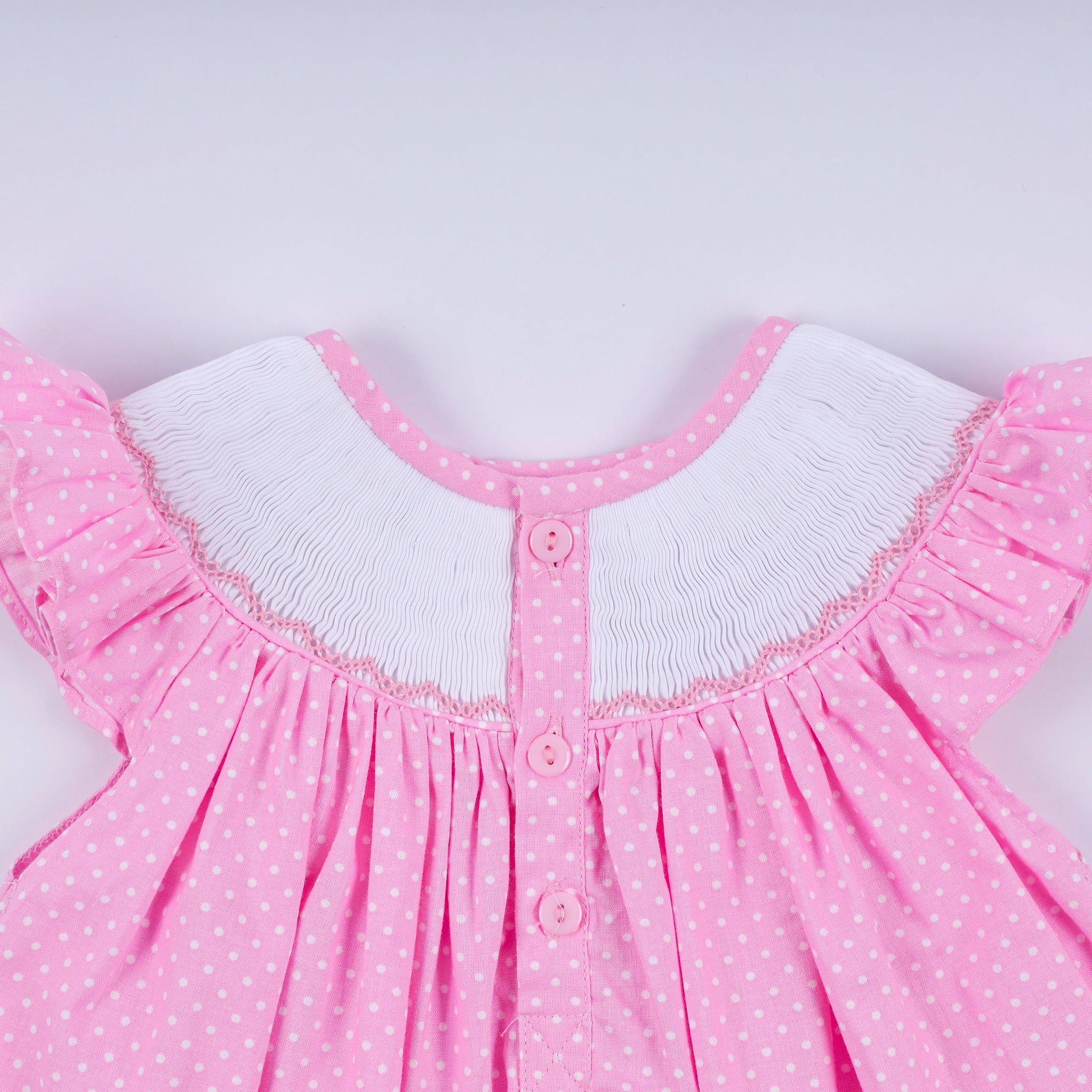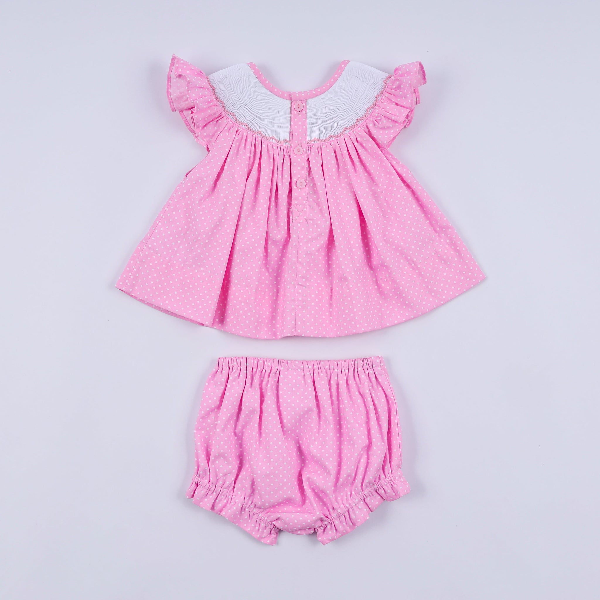 Adorable two-piece set featuring hand-smocked detailing and charming character accents. Soft pink fabric with delicate dot pattern creates a sweet, vintage-inspired look. Ruffled bloomers offer comfortable, playful style perfect for little ones. The smocking adds texture and dimension while maintaining breathable comfort. Ideal for special occasions or everyday wear that makes getting dressed fun and fashionable.