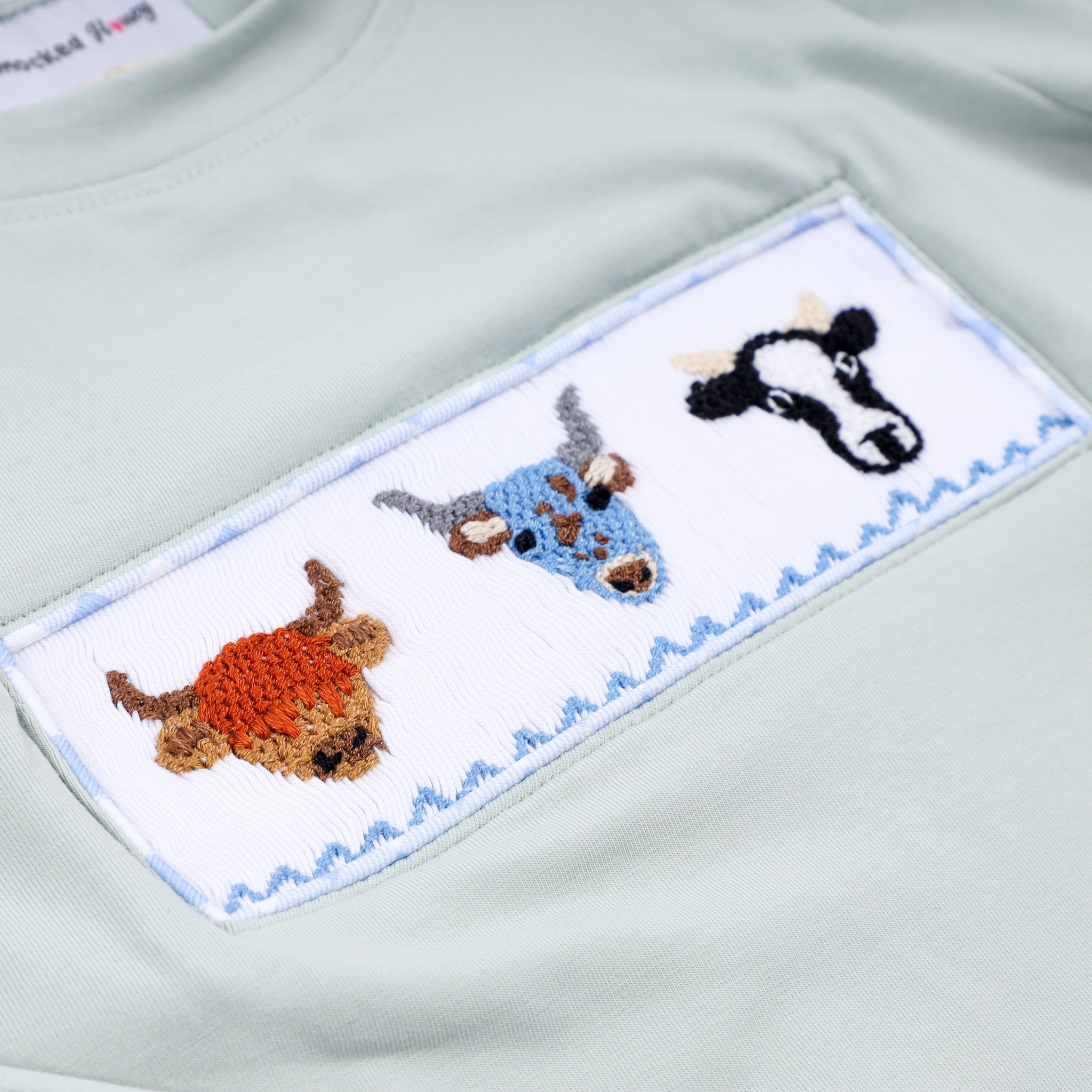 Adorable sage-toned gingham pants set featuring charming cow motifs and delicate hand-smocked detailing. Perfect for little ones who love whimsical style, this cozy set combines comfort with countryside charm. The soft gingham pattern pairs beautifully with the playful cow design, making it an instant favorite for playdates, family gatherings, or everyday wear. Gentle on sensitive skin and designed for all-day comfort.